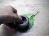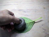 2) 玉づくり ミニ窯用作品作りの基本は継ぎ目が無く丈夫な 『玉づくり』 です。 手ロクロを使って作れば簡単ですが、ここでは木の葉をロクロ代わりに使った趣のある方法(吉田式)を紹介します。