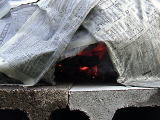 ・時々、焚き口から うちわで扇いで火力を上げてやります。 |