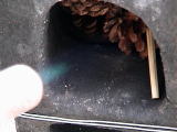 ・更に焚き口に松ぼっくりと割り箸を詰めて、火入れ前の準備完了です! |