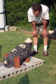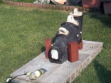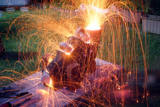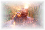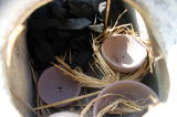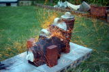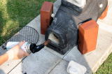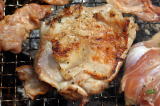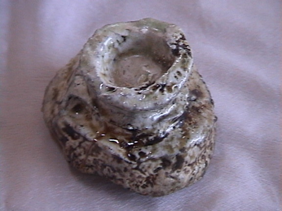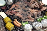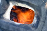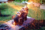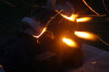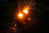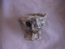 '05/7/17( 日)11:30 各自制作してほぼ乾燥まで終えた作品を持ち寄って、ミニ窯パーティーの開始です。 まずは室内でカセットコンロを使った素焼きをじっくり時間をかけて行います。 作品の素焼きとともにバーベキュースタート! お天気にも恵まれて絶好のバーベキュー日和(じゃなくて)窯焚き日和です。 まずは再会を祝してカンパイ!(飲みすぎ注意?) それでは点火しま〜す・・・ってこれは食事用。![]() ![]() ![]() 炭火は何を焼いても絶品ですね。 アルミホイルに包まれているのはミニ窯に入れる作品の素焼き?いやいやこの後いただくジャガイモでした。 これがことのほかおいしく好評でした。ジャガイモはまず新聞紙で包んでからくしゃくしゃのアルミホイルで包んで遠火でゆっくり焼きます。ぜひ一度お試しあれ。 ![]() ドミさんの愛犬ヴィーゴ、暑そうですねぇ。 ミニカマキリ発見!さてさて、お腹もふくれて酔いも少々・・・。 ジェフさん、ミニ窯のフタで『サムライ!!』 ![]() お国に帰れば穴窯を含め40基もの窯を持つジェフさんも初めて見るミニ窯に興味津々。 ミネソタの地にミニ窯が根付く日も近い!? ![]() 14:00 作品の方もカセットコンロ+中華なべで 乾燥〜素焼きまで完了しました。 (乾燥約1時間、素焼き約1時間) 今回は灰の付きが良くなるように釉薬を少し吹き付けてからの窯詰めです。 ![]() ![]() ![]() 窯詰め・炭詰め・・・ せっせ、せっせと詰め込みます。炭はちょっと贅沢をして『ナラ炭』 6kgを準備しました。 ドミさん、写真いっぱいカメラマンありがとう! 15:30 それでは、ミニ窯点火です!点火前の御参りでは、私以上に真剣に手を合わせてくれたお二人でした。 スタートはいつものように遠くからドライヤーでの送風でゆっくりと・・・。 しっかり火が熾きてきたところで、今回もブロワ−にチェンジ。 温度が上がるまでちょっと近所を散歩しました。田んぼを渡る風がきもちイイ。ドミさんに「福島の『ウェーブゆい』さん主催のミニ窯イベントにお誘いをいただいたんで、一緒に参加したかったけど今年は残念ながらスケジュールの都合がつかなかったよ。」って話したら、すごく残念がって来年はゼッタイ行こうねって約束させられちゃいました。 辺りが薄暗くなり、いい炎が出てきて俄然盛り上がってきました。陶芸好きの炎好きは万国共通!? ![]() ブロワ−を更に近づけて、ガンガン炭を足してやります。相変わらず炭を食う窯ですねぇ・・・。ナラ炭6kgはすでに灰になりました。マングローブ炭3kgの箱開封です。![]() マングローブ炭は火の粉が良く飛びます。さながら花火の様子にみんなお祭り気分最高潮になってきました。 草履履きの私はアチチ・アチチ!(写真は長時間露出のため明るいですが、ほんとは真っ暗なんです。) ![]() ![]() ![]() きれいですねぇ〜。ホ〜ンット、ミニ窯っていいですねぇ〜。 ![]() この写真いいでしょ? ほとんどバクハツですよね。『ミニ窯噴火』ってカンジ。 ドミさん、カメラの腕もプロ級です。 20:00 ナラ炭6kg、マングローブ炭3kg 合計9kgの炭を焚き尽くしたところで終了としました。 焼成時間 約4.5時間 送風を止め、真っ赤に光る作品を取り出し水につけて完了!! 楽しい作品鑑賞の宴は夜更けまでつづくのでした・・・。 【 今回の教訓 】 ・ドミさん、ジェフさんのように器の表面に大胆な凹凸の変化を持たせた作品スタイルは灰の付きが良くミニ窯向き。 ・急熱急冷のミニ窯には厚い作品の方が丈夫そうに思えますが、素焼きでも本焼きでも厚い部分が『はぜ』てしまいました。 ・制作時の土練り(菊練り)での空気抜きはやっぱり重要。素焼き・本焼きの徐熱もやっぱり大切。 ・この窯はやっぱり焼成室では温度が上がってくれません。燃焼室と焼成室前列がGood! ・ナラ炭 は火の粉も少なく、溶けた灰の色もきれい。イイ炭ですね。 ・草履履きでのミニ窯焼成はヤケドのもと。(あたりまえでした。) 【 今回の作品紹介 】 この他にも数点、互いに気に入った作品を交換し合いました。 ![]() ![]() ![]() やはり、翌日の窯掃除で出てきたカケラは素晴らしい焼締り方とビードロの照りをしていました。(笑) |