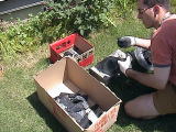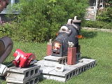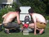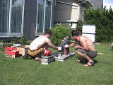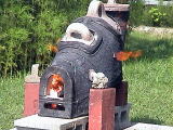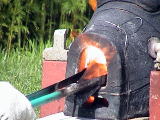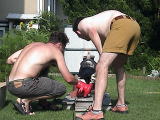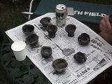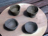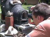'05-8-17作成来日中のジェフさん、ミニ窯パーティーでの焼成体験がよほど気に入ったらしく「帰国前にぜひもう一度やりたい!」との熱い熱い申し入れに応えて・・・。 一週間後の今日(7/24) ふたたびミニ窯に火が入りました。 先週の焼成で要領をつかんだ彼らは、今回『炭化』をやってみたいとのことです。 今回はみんな陶芸家の顔で、パーティー気分抜き(?)の真剣勝負です!! |